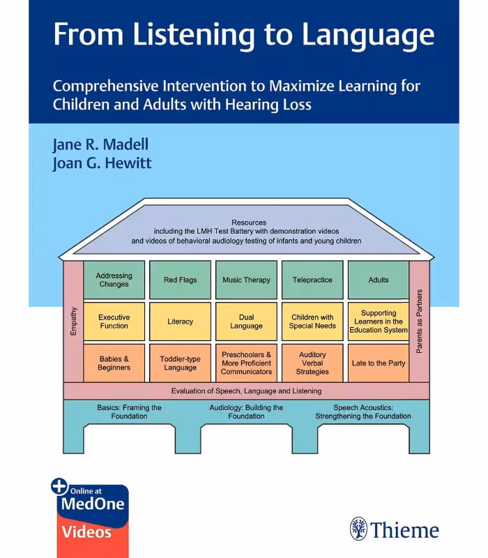 A unique resource for helping children and adults with hearing loss develop listening and spoken language as the foundation for cognition, literacy, and educational advancementSubstantial neurobiological evidence indicates hearing is the most effective sensory modality for developing spoken language and cognition. From Listening to Language: Comprehensive Intervention to Maximize Learning for Children and Adults with Hearing Loss, edited by renowned clinicians Jane R. Madell and Joan G. Hewitt, features contributions from a distinguished group of experts. The text focuses on evidence-based practice to maximize the learning potential of children with hearing loss by nurturing the auditory brain development necessary to help them learn to listen and talk, as well as helping adults build stronger listening skills.Six sections and 22 chapters cover the spectrum of comprehensive listening and spoken language intervention for all age groups (including adults) and for the professionals working with them. Topics include literacy, executive function, bilingualism, dual diagnoses, educational support, changes in auditory access, red flags for auditory development, music therapy, telepractice, and intervention with adults. In-depth discussions of the stages of speech and language development for the diverse population of children with hearing loss assist new and experienced clinicians develop effective therapeutic and educational plans and encourage caregivers to become effective partners in their children’s progress.Key FeaturesReader-friendly chapters with summaries, key points, pearls, and pitfalls facilitate learningCase studies assist clinicians in applying chapter informationA wealth of LSL resources, assessments, charts, suggested readings, websites, and more provide the opportunity to expand knowledgeVideos offer examples of hearing evaluation of infants and young children and speech perception testing, including demonstrations of the LMH (Ling-Madell-Hewitt) Test BatteryThis is an essential textbook for graduate courses in audiology, speech-language pathology, early intervention, and deaf education, and an invaluable resource for new and experienced professionals and the caregivers with whom they work.This print book includes complimentary access to a digital copy on https://medone.thieme.com.
